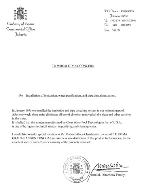 Übersetzung: Betreffend: Installation des Ionisations Wasserdesinfinfizierungssystems, und Rohr-Entkalker Systems. Im Januar 1995 haben wir das Ionisations Wasser- desinfinfizierungssystems, und das Rohr-Entkalker System in unseren Pool eingebaut. Nach einer Woche konnten wir ganz auf Chlor verzichten und alle Algen und anderen Partikel im Wasser waren beseitigt. Ich bin der Überzeugung davon, das dieses, von ClearWater Pool Tecnologies Inc. aus den USA, gebaute System den höchsten technischen Standard zur Reinigung und Desinfizierung von Wasser hat. Ich möchte auch noch ganz besonders, den Eigentümer der Firma F.T. Prima Grahabangun Tungal, Herrn Michael Aloen Chandranata, erwähnen, der den exklusiven Vertrieb dieses Produkts in Indonesien hat, wegen des hervorragenden Services und der zweijährigen Garantie dieser eingebauten Geräte. (Anmerkung: Heute ist die Garantie 5 Jahre!) |